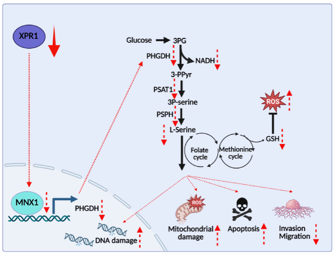 该研究首次发现XPR1在肝细胞癌病人组织中显著上调,其表达与患者预后密切相关。在细胞实验中,XPR1的敲降导致HCC细胞丝氨酸水平显著降低,关键丝氨酸合成酶PHGDH的蛋白表达下降,同时导致氧化还原稳态受损、细胞进展相关功能被抑制以及明显的线粒体碎片化。并且鉴定出MNX1是PHGDH的一个转录因子。在XPR1敲低的HCC细胞中恢复MNX1或PHGDH的表达,均能有效恢复氧化还原能力并挽救肿瘤进展相关的功能。此外,在敲低XPR1的HCC细胞重新表达PHGDH可有效恢复HCC在动物体内的致瘤能力。该研究结果表明,在HCC中敲低XPR1会破坏MNX1介导的PHGDH表达调控,损害丝氨酸代谢并诱发氧化还原失衡,最终抑制HCC进展。这些发现提示XPR1有望成为HCC治疗的一个潜在靶点,后续将在此基础上开展靶向药物的可行性研究。同时该研究也揭示了XPR1作为哺乳动物唯一磷酸外排转运体在肿瘤进展尤其是代谢过程中的新作用机制。