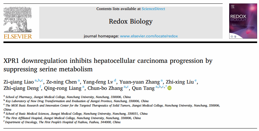 近日,南昌大学药学院唐群研究员团队在Redox Biology(IF=11.9, 中国科学院一区Top期刊)上发表了题为“XPR1 downregulation inhibits hepatocellular carcinoma progression by suppressing serine metabolism”的研究论文,报道了一种调控肝细胞癌(HCC)进展的新机制,首次揭示了跨膜磷酸盐转运蛋白XPR1在其中发挥的作用。研究团队通过多组学联合分析发现HCC细胞的XPR1敲降导致丝氨酸代谢过程被显著抑制,并且通过体内外实验对XPR1调控丝氨酸代谢在肝细胞癌进展中的作用机制进行了探究。南昌大学药学院23级博士研究生廖自强为论文第一作者,唐群研究员为论文通讯作者。